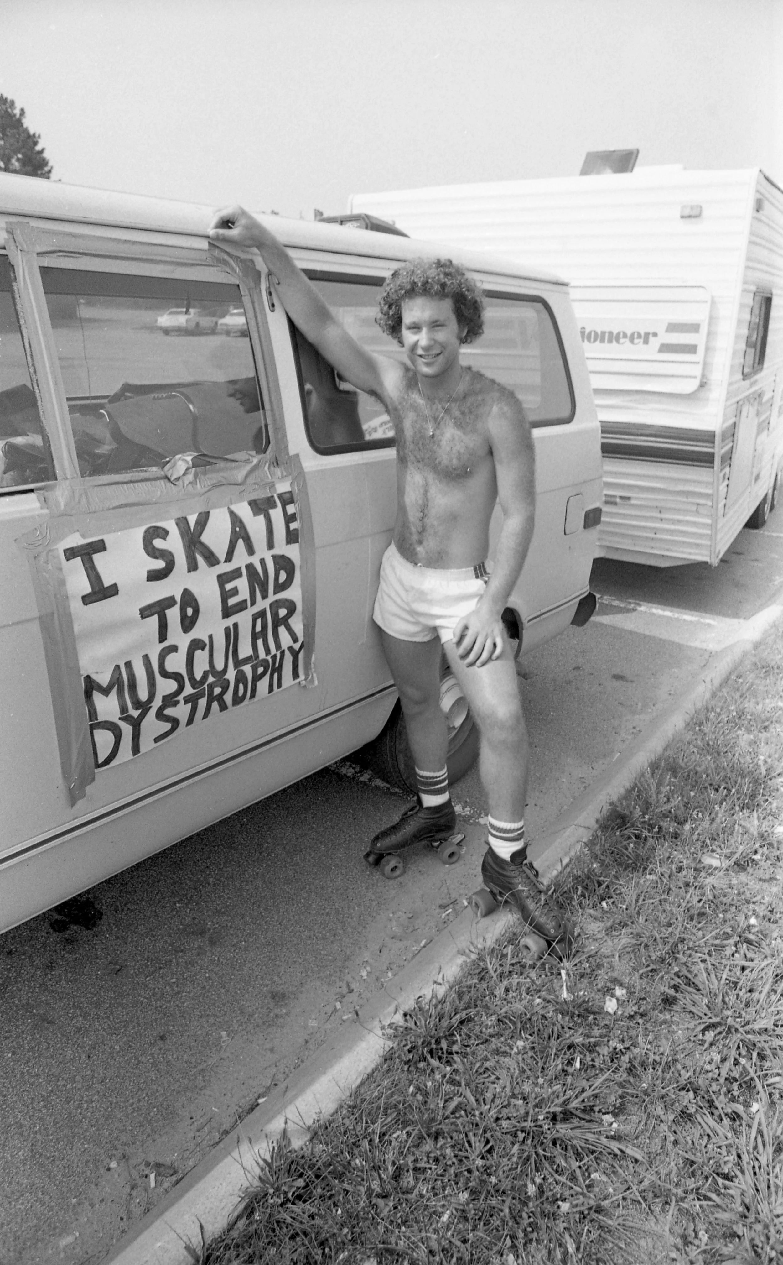 On May 8, 1980, Ron Mossler left Los Angeles and began skating across the country in a fundraising effort against muscular dystrophy. Here he is pictured on July 13th, during his trip in Raleigh off North Boulevard (now known as Capital Boulevard).