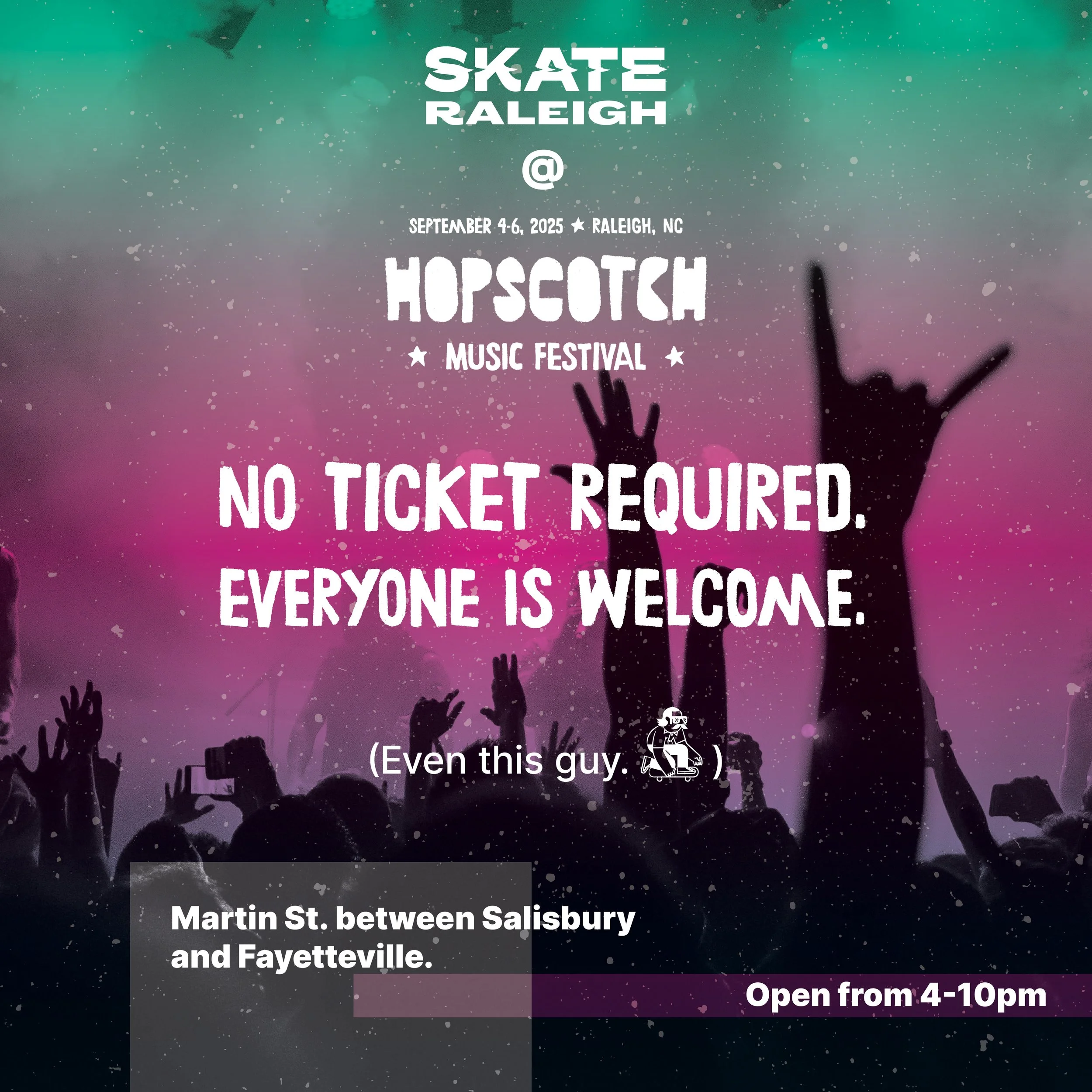 Whether you're attending Hopscotch this year or not, you're more than welcome to come downtown and hit the skatepark, hang with friends, grab some food, enjoy our lineup of DJs, and have a great time.